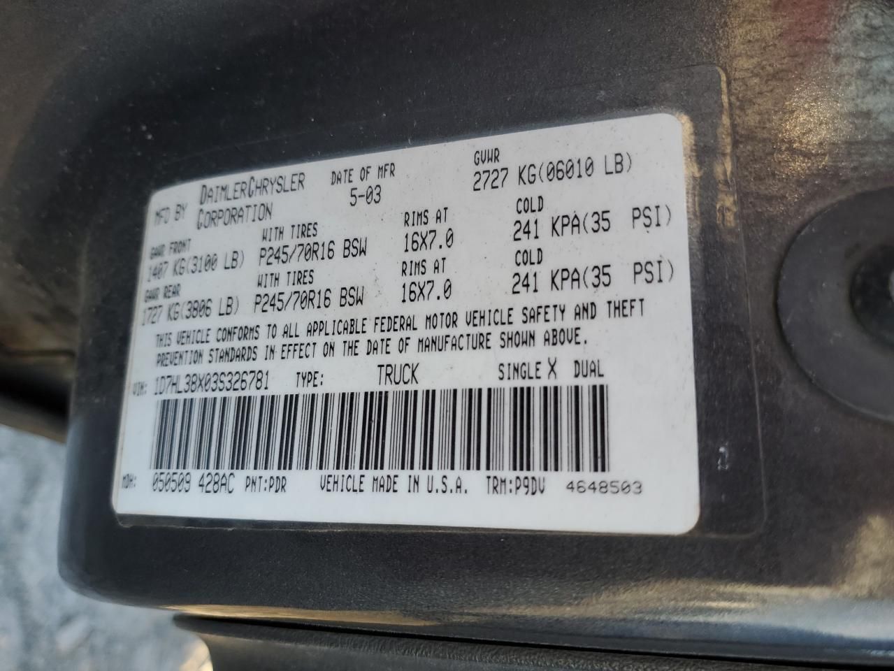 • Investigación del Código VIN: Usa el número VIN para descubrir el historial de este 2003 Dodge Dakota Quad Sport.